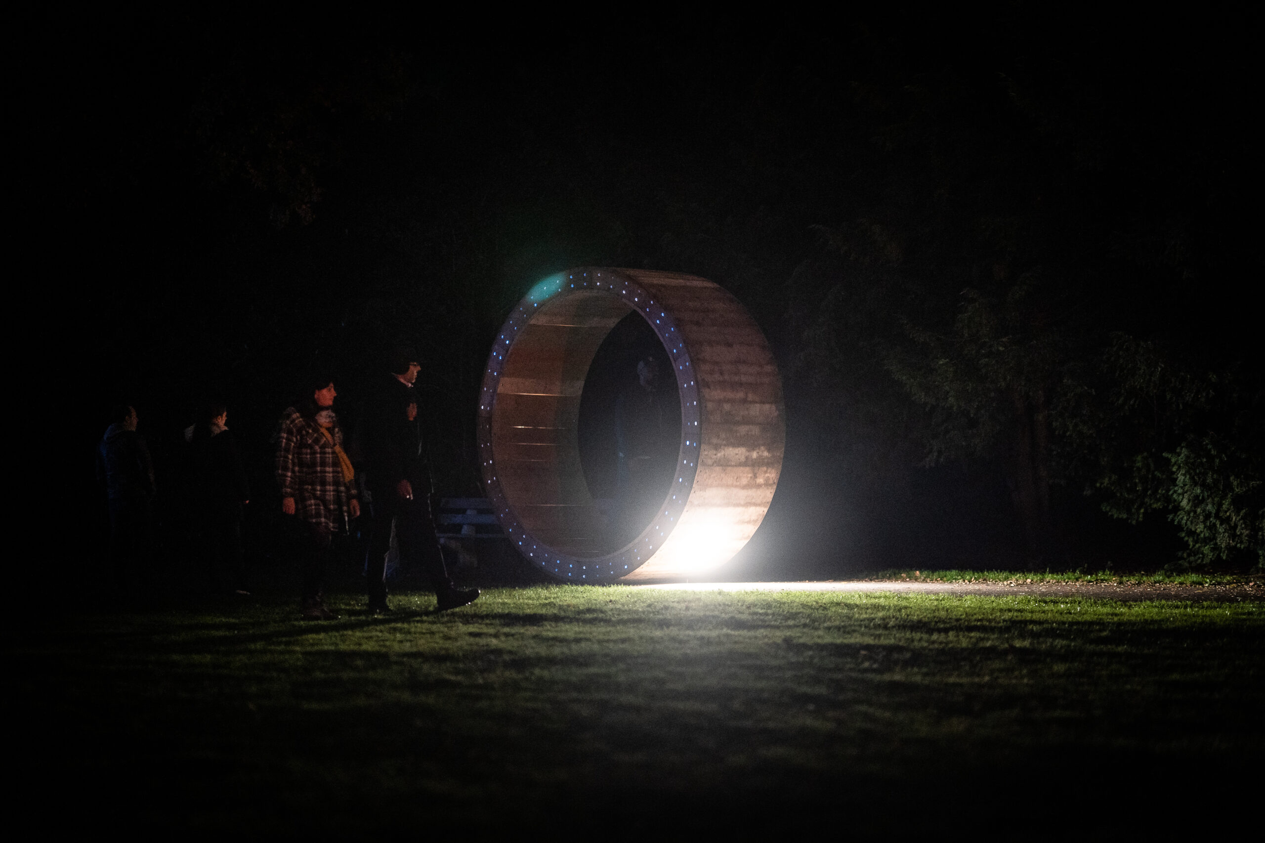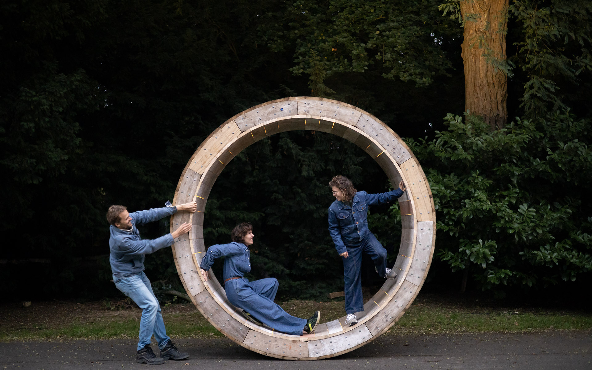 Het werk is voorzien van een groot houten wiel met één licht dat de omgeving verlicht. Terwijl bezoekers in het wiel lopen, brengen ze een langzame compositie in beweging. Elke beweging veroorzaakt geluid en licht, waardoor een voortdurend evoluerend ritmisch landschap ontstaat. De projectie van geluid, licht en beweging creëert een polyritmische ervaring waarin het publiek actief vorm geeft aan de perceptie van tijd.