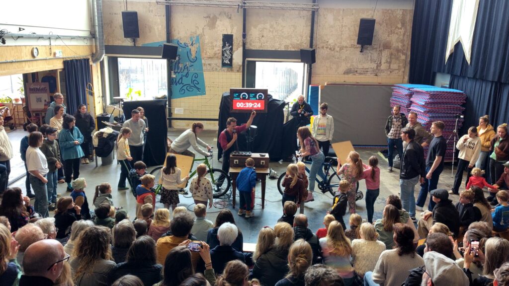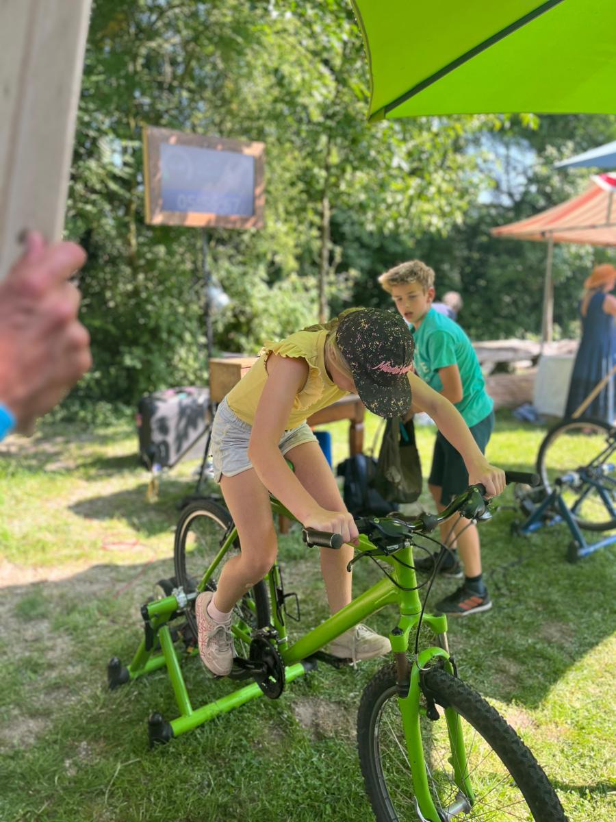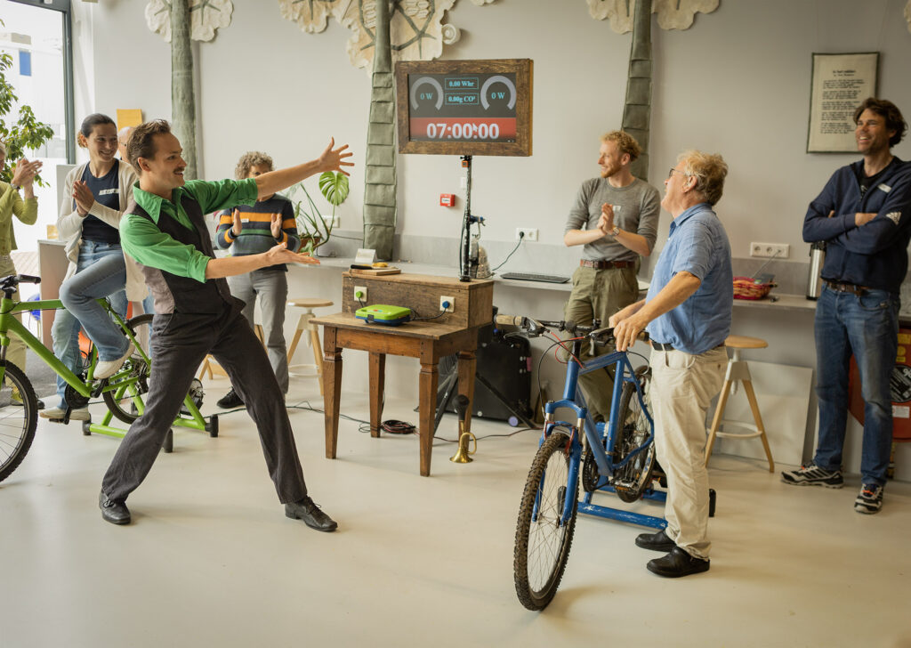 En we gaan los! Er wordt gejuichd, geschreeuwd, gejoeld en gezweet. De eerste fietsers moeten het hartst werken, om het tostiijzer op temperatuur te brengen, en dat moet dan warmgehouden worden. In korte sprints van 30 tot 60 seconden wisselen de teamleden elkaar af, terwijl ik onze teams en de toeschouwers door de estafette coah met sportcommentaar. Daarin geef ik en passant meer context voor hoeveel energie ze nou eigenlijk opwekken door middel van dagelijkse voorbeelden zoals afgebakken afbakpizza’s, kopjes espresso, minuten netflixen, procenten telefoon opladen en secondes douchen.